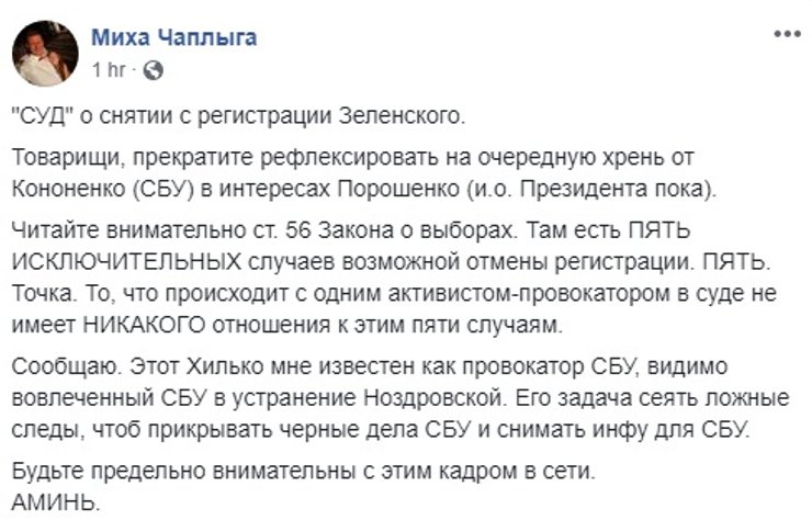 Наблюдатель на выборах от общественной организации "Украинская ассоциация акционеров" подал иск в суд об отмене регистрации Владимира Зеленского кандидатом в президенты. Суд оперативно иск рассмотрел и отклонил около часа ночи, а в соцсетях тем временем пытаются понять, что это было