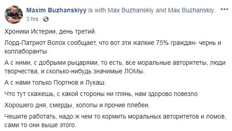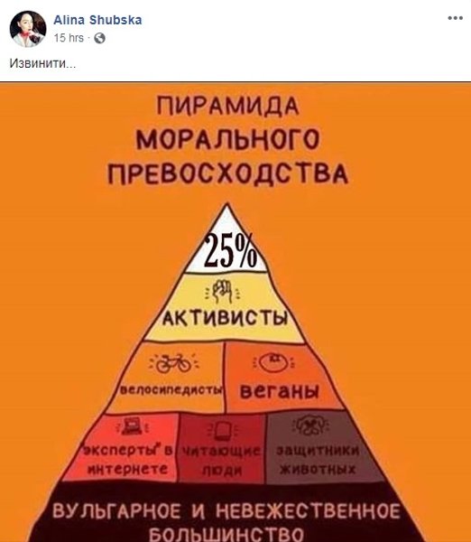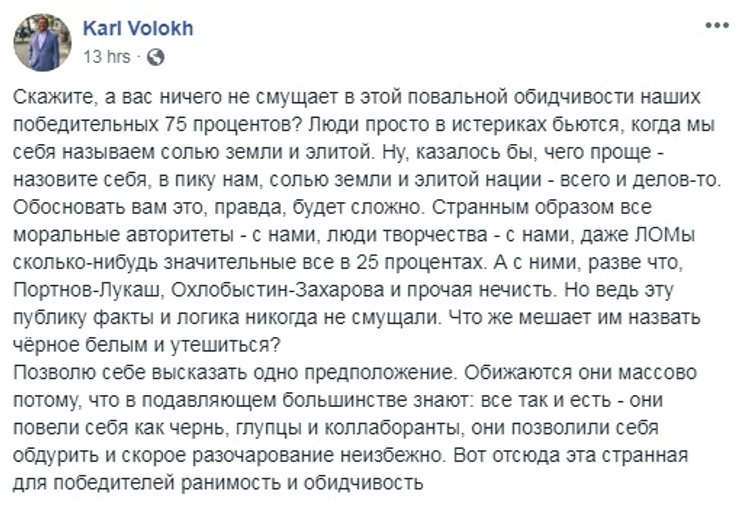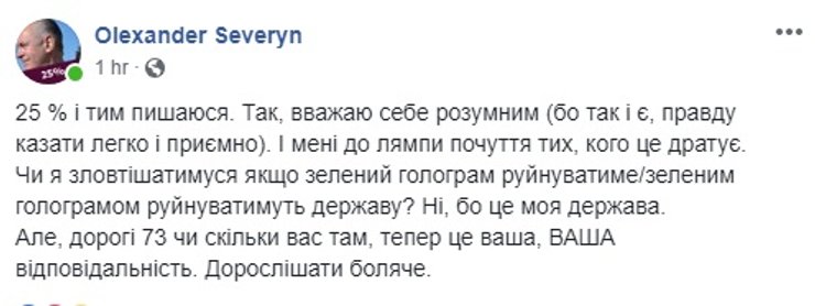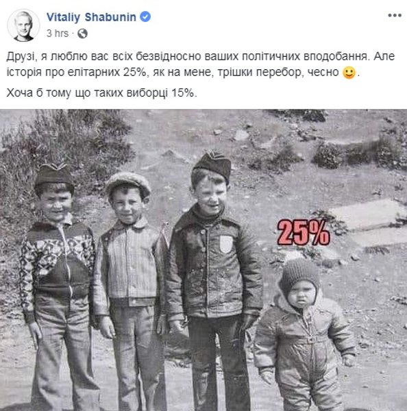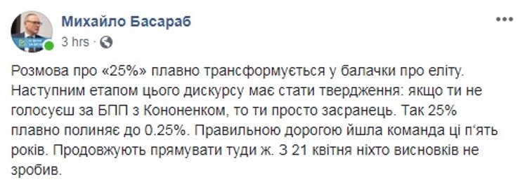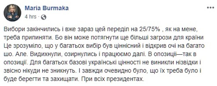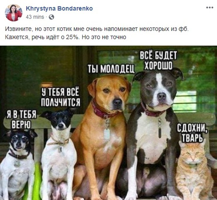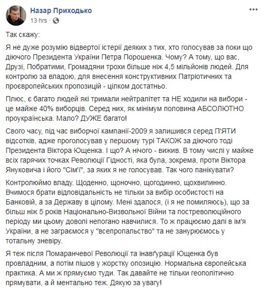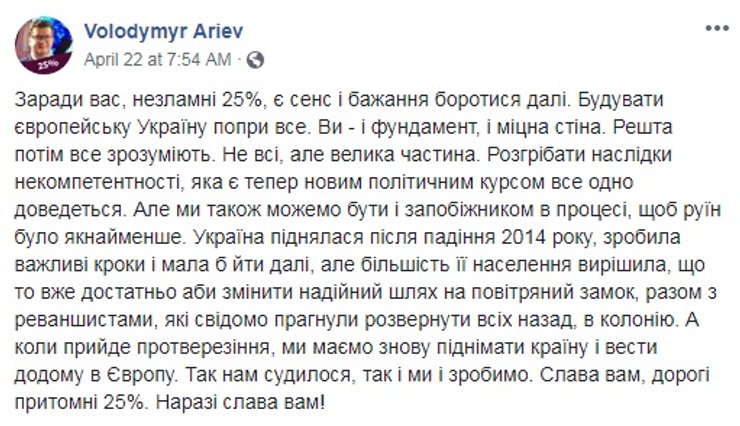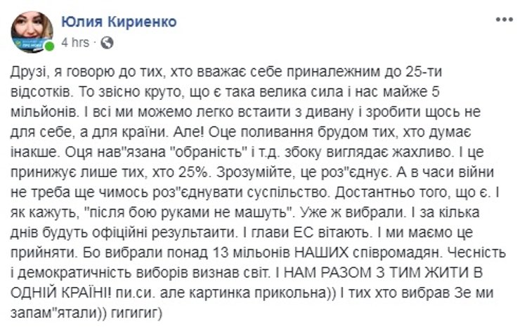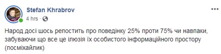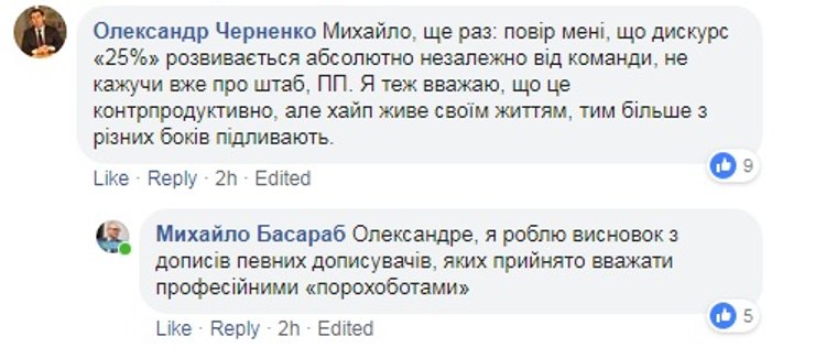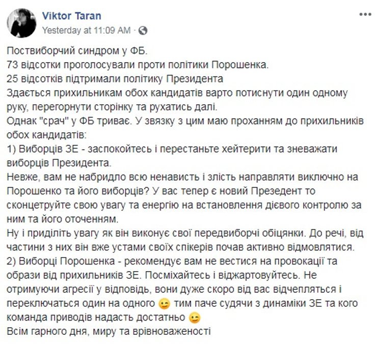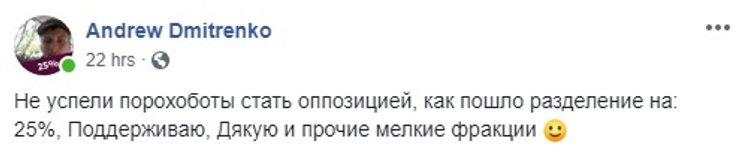 Отметим, что в Facebook-сообществе многие из тех, кто поддерживает Порошенко и входит в эти 25%, выступили против нагнетания ситуации и разделения населения Украины на некие группы по постоянно меняющимся признакам.