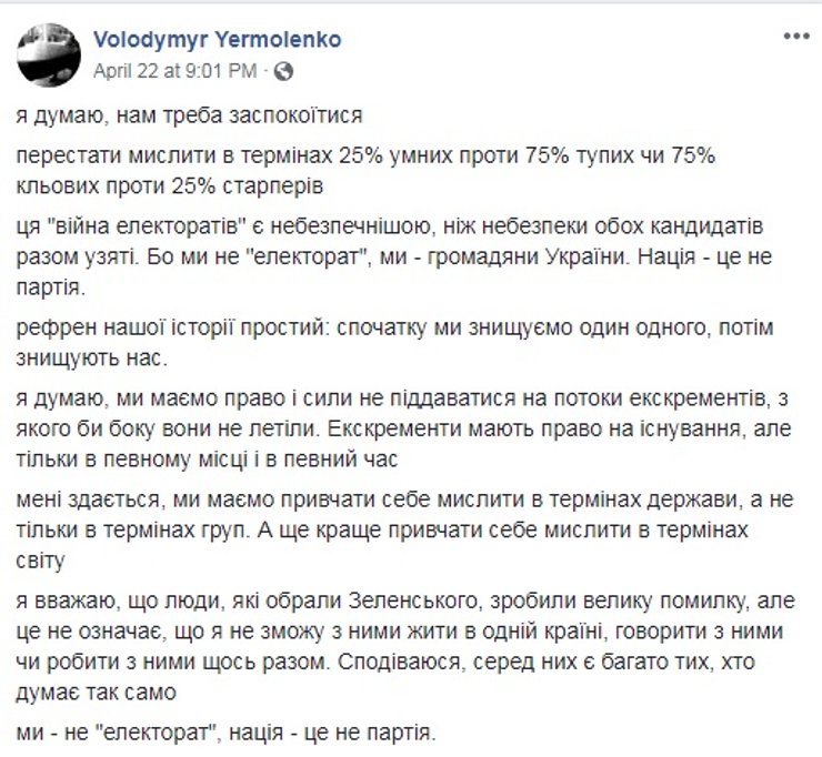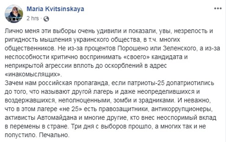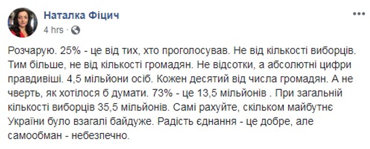 Да и деление украинского общества на 25% и 73% на основе электоральных предпочтений на президентских выборах не совсем оправдано, поскольку голосование во втором туре за того или иного кандидата не означает полную поддержку его программы.