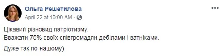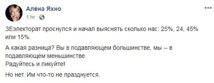 На посты и комментарии такого содержания в соцсетях появилась и соответствующая реакция. Сторонникам "элитарного флешмоба" указали, что Зеленский лидировал во всех областях, кроме Львовской. Поэтому можно заключить, что голосовали за него самые разные люди. Подвязать их под некий собирательный образ "избирателя Зеленского" не получится. И главное, Украина – демократическая страна, и поэтому необходимо уважать выбор людей, а не называть их "зомби" и "ватниками".