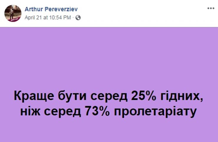 При этом многие пользователи ограничились рамками на аватарках с изображением 25% на бордовом фоне, надписями "Дякую", "Yes. I`m from Ukraine. No, i didn`t vote for the comic" и им подобными, а также постами благодарности в адрес Порошенко. Другая же часть сторонников проигравшей стороны пошла дальше и вложила в флешмоб иную суть – не просто консолидировать меньшинство, но указать, что именно 25% являются "проукраинским меньшинством", "здравомыслящими избирателями", просто "умными", " достойными" или даже "элитой" украинского общества, а остальные 75% – "глупцы", "коллаборанты" или "пролетариат".