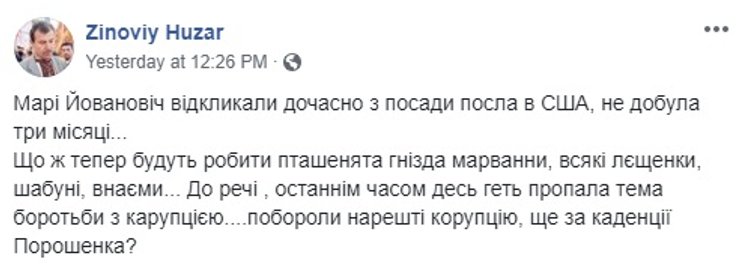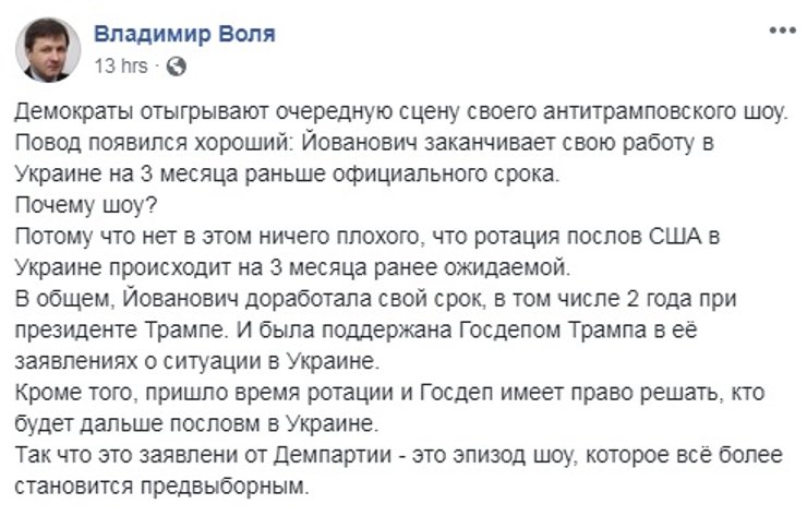 "Посол Йованович является преданным государственным служащим и дипломатом высокого уровня, который представлял Соединенные Штаты как при республиканских, так и при демократических администрациях. Возмутительное решение Белого дома отозвать ее является ударом по политическим позициям США", – говорится в заявлении лидера демократов в Палате представителей США Стени Хойера и председателя Комитета по иностранным делам Элиот Энгель.