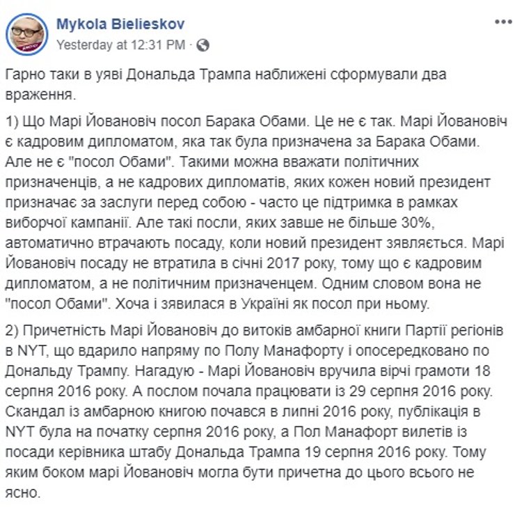 Украинская и американская внутренняя политика тут, несомненно, перемешались. О том, что Мари Йованович с помощью директора НАБУ Артема Сытника якобы пыталась повлиять на исход президентских выборов в США и помочь лидеру демократов Хиллари Клинтон говорят давно. В Украине даже открыли уголовное дело о возможном вмешательстве должностных лиц в американские выборы. А директора НАБУ Артема Сытника вызвали на допрос в ГПУ.