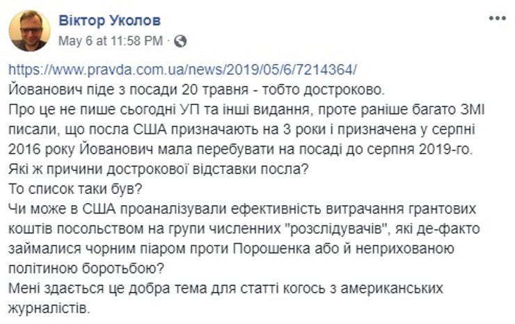 Слухи о возможной отставке посла США циркулировали последние месяцы. И усилились в связи со скандалом со "списком Йованович". В марте генпрокурор Юрий Луценко дал интервью американскому консервативному изданию The Hill. И заявил, что во время первой встречи с ним Мари Йованович передала ему некий список неприкасаемых, в отношении которых нельзя проводить расследования. Также речь шла о 4 миллионах долларов, которые якобы предназначались Генпрокуратуре Украины, но так туда и не дошли.