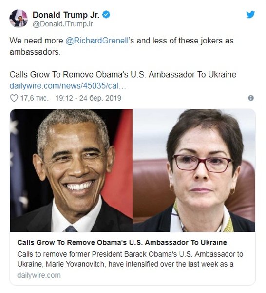 Про отзыв Йованович говорил и сын Дональда Трампа. Называл ее "джокером" и прямо заявлял, что послом в Украине должен стать кто-то другой.