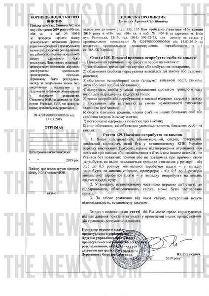 Согласно повестке, он должен явиться 10 мая 2019 года в 10 часов для допроса в качестве свидетеля в уголовном производстве.