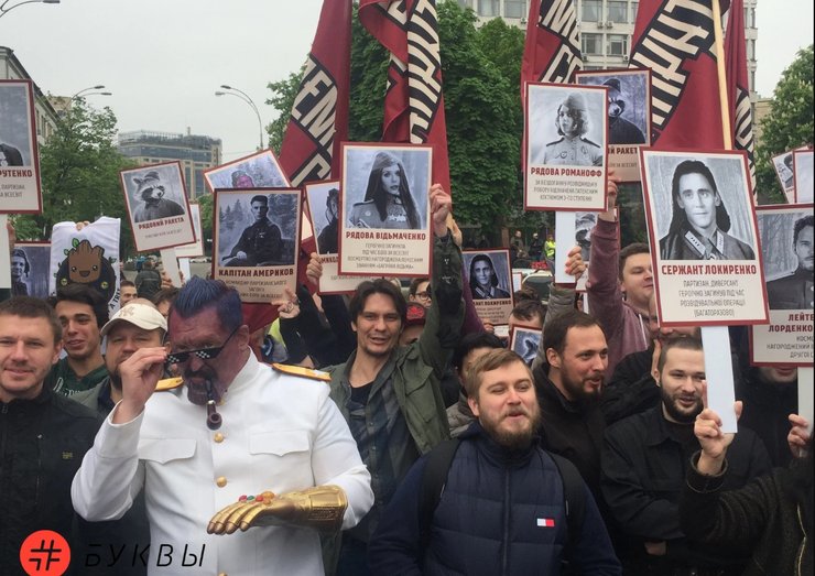 Также в рядом с шествием провели акцию-пародию "Бессмертный грут", которую устроили активисты "Демократической сокиры". Вместо портретов солдат советской армии они принесли изображения героев комиксов и фантастических фильмов. Правоохранители во избежания конфликтных ситуаций пересечься участникам двух акций не позволили, хотя в прошлом году активисты этой организации были пропущены за ограждение.