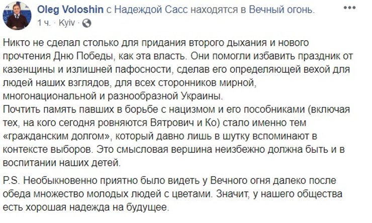 Сегодня утром Порошенко выпустил отдельное поздравление украинцев с Днем победы над нацизмом, в котором отметил "величественный подвиг и жертвенность украинского народа".