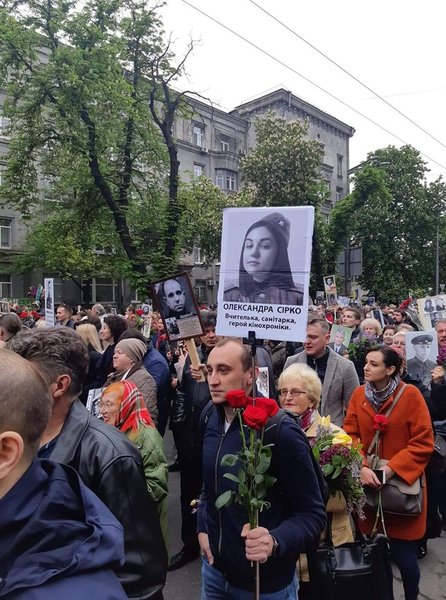 Так, в Киеве задержали организатора акции "Никто не забыт, ничто не забыто", аналога российской акции "Бессмертный полк", Елену Бережную за нарушение общественного порядка. Мать погибшей Ирины Бережной (экс-депутат Партии регионов) пыталась пройти к месту проведения марша в футболке с изображением георгиевской ленты. Данная символика в Украине запрещена, снять ее Бережная отказалась и была задержана.