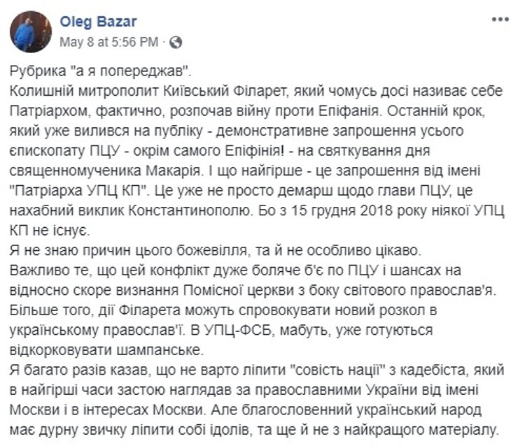 Напомним, что скандал начал разгораться еще на прошлой неделе, когда стало известно о созыве Филаретом церковных иерархов на торжественное богослужение во Владимирском соборе в Киеве и "братскую беседу" 14 мая, когда отмечают день памяти священномученика Макария. При этом приглашения были разосланы на бланках УПЦ КП и среди из адресатов не оказалось предстоятеля ПЦУ митрополита Епифания.