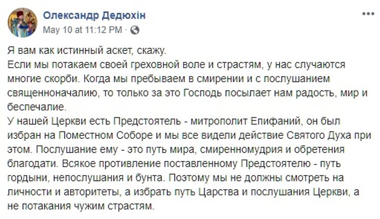 Митрополит Епифаний в свою очередь заявил, что 14 мая он собирается поехать на Донбасс. И отменять давно запланированную поездку не намерен.