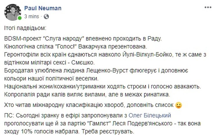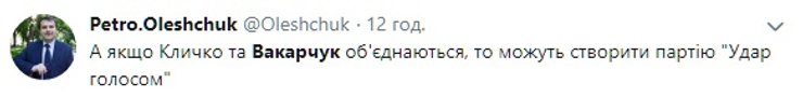 Не обошлось и без сравнений с новоизбранным президентом Владимиром Зеленским. В частности, прозвучало мнение, что Вакарчук, в отличие от своего коллеги по творческому цеху, объединяет украинцев вокруг "положительной идеи". Одновременно в соцсетях отметили, что солисту "Океана Эльзы" будет сложнее завоевать поддержку широкой аудитории, поскольку для многих простых украинцев он не ассоциируется с политикой (пусть даже в формате теле-шоу), а его образ по-настоящему популярен не во всех регионах страны.