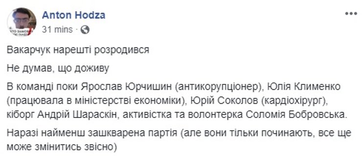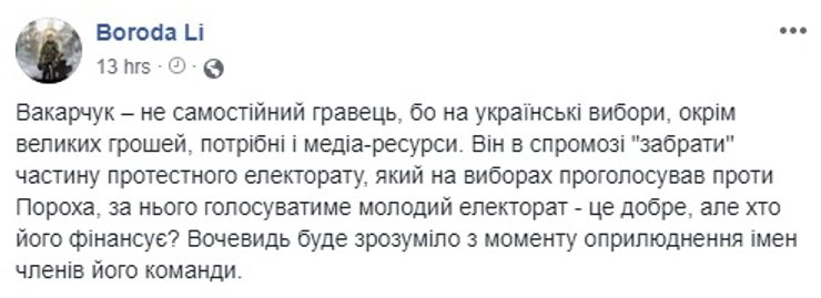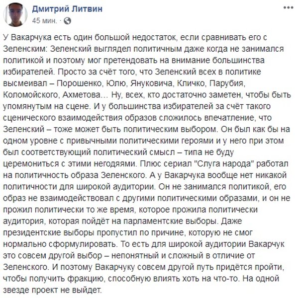 Одновременно прозвучала и критика заявленного Вакарчуком похода в политику. Среди главных контраргументов – все та же неопытность, которая ставилась в упрек Владимиру Зеленскому, негативный опыт парламентской деятельности десятилетней давности и опасения, что молодой политик будет зависеть от олигарха – в данном случае от Виктора Пинчука. Некоторые пользователи также предположили, что проектом Вакарчука могут воспользоваться представители нынешней власти для продолжения политической карьеры.