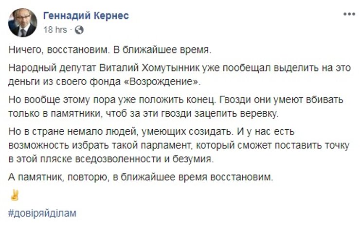 В это раз мэр Харькова заявил, что памятник восстановят, а нардеп Виталий Хомутынник пообещал выделить деньги на эту задачу.
