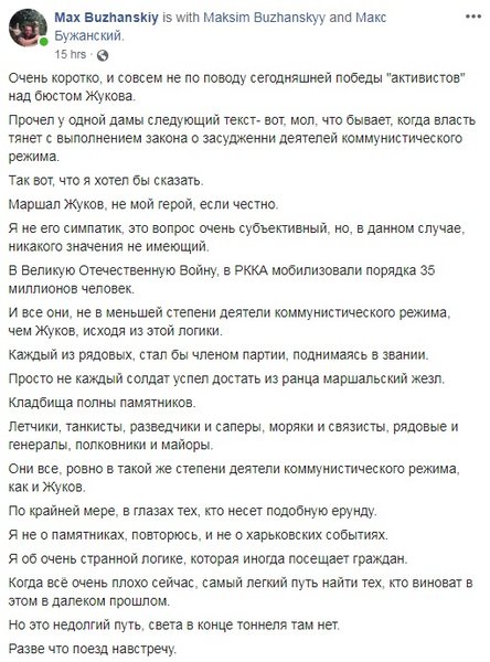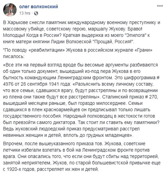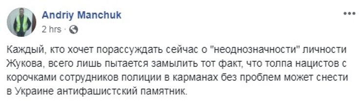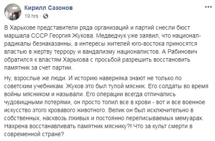Но такую позицию разделили далеко не все. Осуждение действиям националистов выразили в том числе и те, кто не относит Жукова к героям, но считает, что время "революционной вседозволенности" прошло и все граждане должны уважать нормы закона.