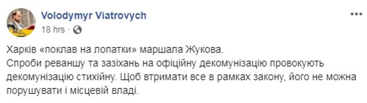 При этом в украинском институте национальной памяти, который внес Жукова в список лиц, которые подпадают под закон о декоммунизации, с таким решением в корне не согласны. Глава ведомства Владимир Вятрович даже пригрозил мэру Харькова ответственностью. В горсовете выводы института не признают. Там считают, что в случае с Жуковым речь идет о личности, которая принимала непосредственное участие в освобождении Украины от нацистских захватчиков и поэтому не подпадает под действие закона.
