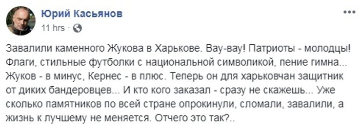 Учитывая такой резонанс вокруг личности советского маршала и его упоминаний в топонимике, снос памятника не остался незамеченным в соцсетях. Сторонники стихийной декоммунизации действия националистов всячески поддержали, не обращая внимание на их законность. Главный аргумент – Жуков один из символов героизированного советского прошлого, от которых необходимо избавляться.
