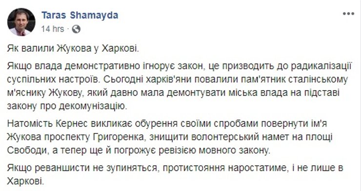 Падение маршала. Украинцы обсуждают "стихийную декоммунизацию" в Харькове