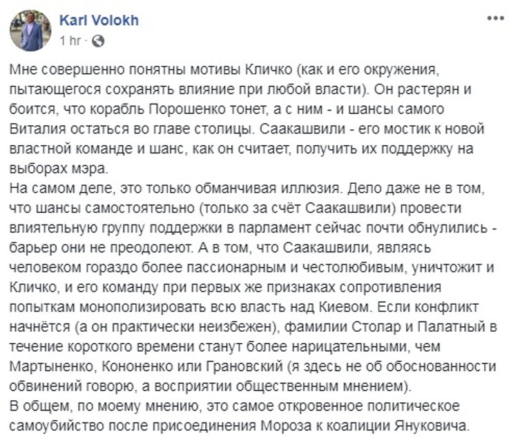 Мэр Киева Виталий Кличко накануне опубликовал на своей странице в Facebook видеообращение, в котором предложил бывшему президенту Грузии и экс-главе Одесской облгосадминистрации Михеилу Саакашвили идти на выборы вместе.