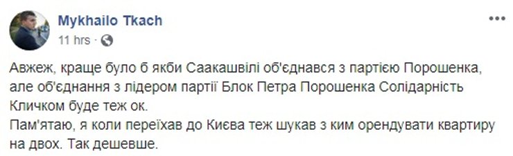 Саакашвили свою позицию озвучил только сегодня. Однако однозначного ответа не дал, а, наоборот, обратился за советом к своим сторонникам. Он заявил, что Кличко его "хороший друг и лучший из мэров Киева", а предложение в целом хорошее. Однако для того чтобы, его "Рух новых сил" пошел на союз с "УДАРом" последний должен избавиться от людей, связанных с коррупцией, и тех, кто был до последнего с Порошенко. Второй вариант – не идти на выборы с Кличком, но в таком случае РНС окажется вне выборов.