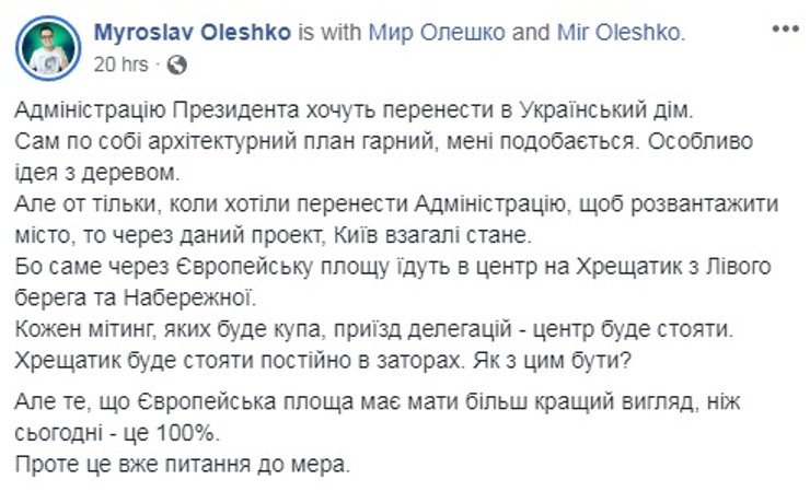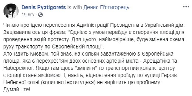 Прозвучали и более практические претензиии к перезду Зеленского в Украинский дом. Ранее президент объяснял свое намерение покинуть нынешнее здание АП в том числе и желанием разгрузить центр столицы от пробок. Однако выбранный вариант может привести к противоположному результату. Европейская площадь – важная транспортная развязка. В час пик там и так возникают заторы, и совершенно нет места для парковки. А если туда переедет целая Администрация президента с многочисленным штатом госслужащих - то центр Киева будет стоять в пробках перманентно.