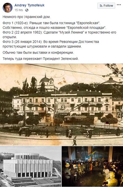 В любом случае, пока президент еще никуда не переехал, хоть и настроен решительно. А пока в соцсетях вспоминают историю Украинского дома. Здание было построено в 1982 году на месте снесенного трехэтажного здания гостиницы "Европейская", давшей название площади. С момента постройки и до 1993 году в нем был расположен Киевский филиал Центрального музея Ленина. С последние годы он используется как выставочный центр, а во время Оранжевой революции и Евромайдана был одним из оплотов протестующих.