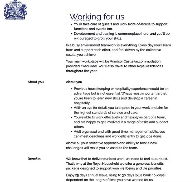 "Вы будете содержать, убирать и ухаживать за широким спектром интерьеров и предметов, гарантируя, что они будут представлены в лучшем виде. Учась у своих коллег, вы приобретете необходимые специальные профессиональные навыки, всегда стремясь к самым высоким стандартам. Вы будете заботиться о гостях и работать на передовой, чтобы поддерживать функции и мероприятия. Развитие и обучение здесь являются обычным делом, и вас будут поощрять развивать свои навыки", – говорится в объявлении.