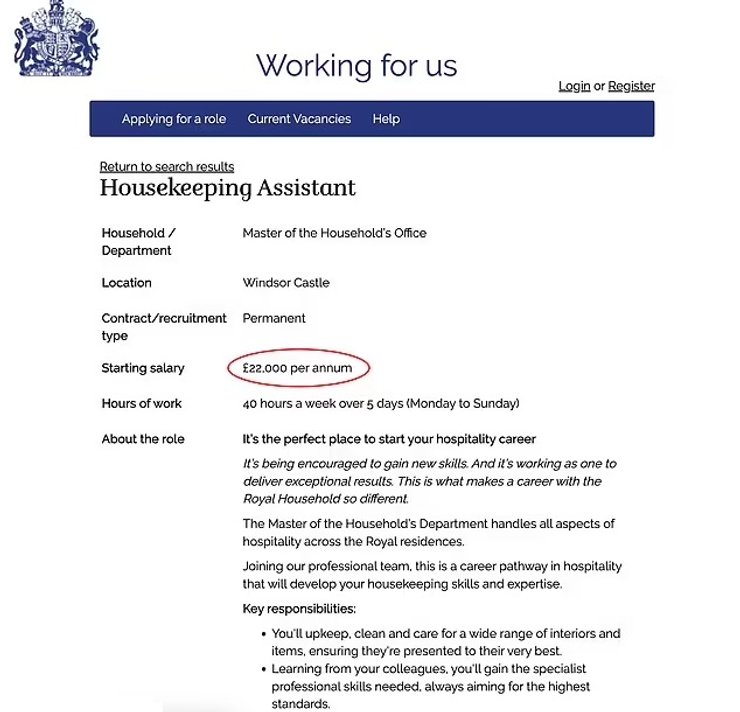 В Виндзорском дворце открылась вакансия домработницы, которой обещают зарплату ниже минимальной. Объявление о вакансии было размещено на веб-сайте королевской семьи.