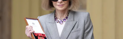 Легендарный главный редактор американского Vogue вошла в список почетных кавалеров в честь дня рождения короля в 2023 году за свой вклад в моду. Верная своему безупречному стилю, она надела сшитый на заказ костюм с драпированной юбкой от Alexander McQueen из коллекции весна/лето 2025.