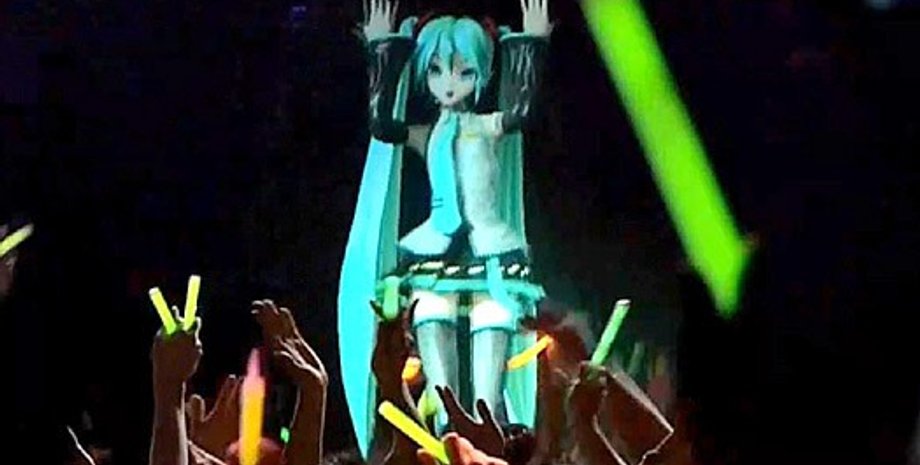 Вдруг прямо из пола на сцене вырастает существо ростом в два с половиной метра – так, что видно из любого уголка зрительного зала. Это девушка. Правда, таких девушек не увидишь на улице. Можно подумать, что персонаж традиционных японских комиксов "манга" или "анимэ". И это существо, как живое, передвигается по сцене, поет, а ее длинные синие волосы струятся от порывов виртуального ветра.