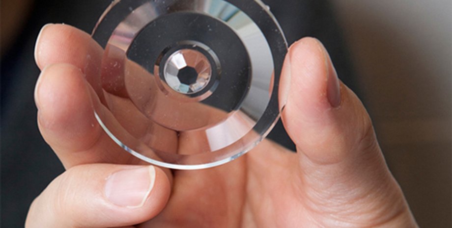 Опытный образец оптического устройства выполнен из термопластичного прозрачного полиметилметакрилата. Готовая линза размером с ноготь несколько напоминает искусственный бриллиант с плоской верхней поверхностью и восемью гранями. Он представляется симметричным, но на деле это не так: по своим размерам и геометрии грани несколько отличаются друг от друга.
