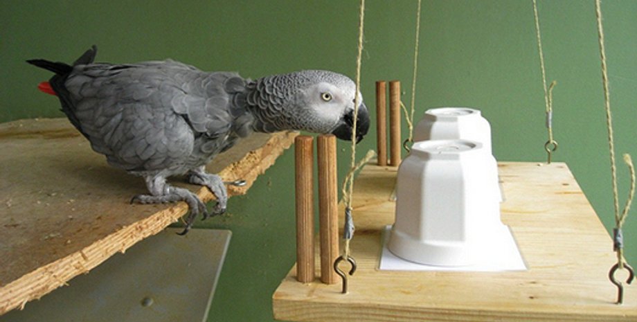 Ученые ставили с несколькими попугаями жако следующий эксперимент, чем-то похожий на игру в наперстки. Птицам показывали две чашки, одну с кормом, другую без, затем чашки переворачивали вверх дном и предлагали выбрать ту, в которой был корм. Потом корм стали прятать в обе чашки (например, в одной были семена, а в другой - орех), но при этом с одной из чашек проделывали следующие манипуляции: на глазах у птиц доставали оттуда корм и либо прятали обратно, либо экспериментатор клал еду себе в карман. Ну а попугай должен был выбрать ту чашку, под которой что-нибудь да осталось.