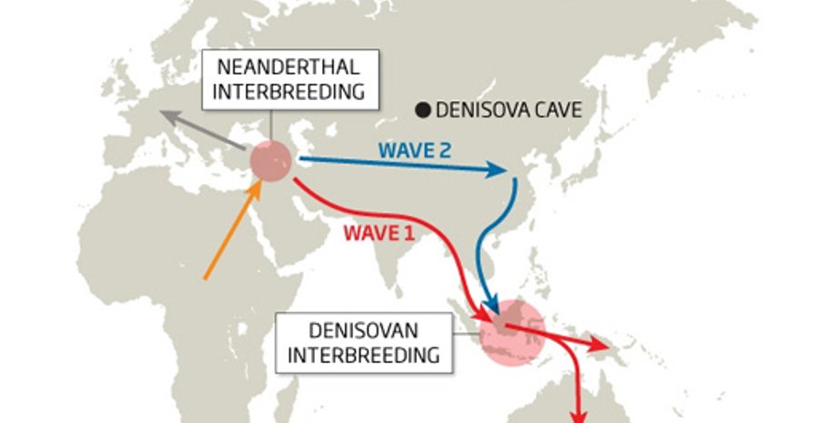 Еще больше денисовских участков ДНК Стоункинг обнаружил в популяциях к югу и востоку от Сибири, особенно на востоке Индонезии, в Австралии, Новой Гвинее, на Фиджи и в Полинезии. Жители континентальной Азии и западных районов Индонезии не обладают денисовскими фрагментами ДНК, то есть их предки представляли собой другую волну миграции, которая не скрещивалась с денисовцами.