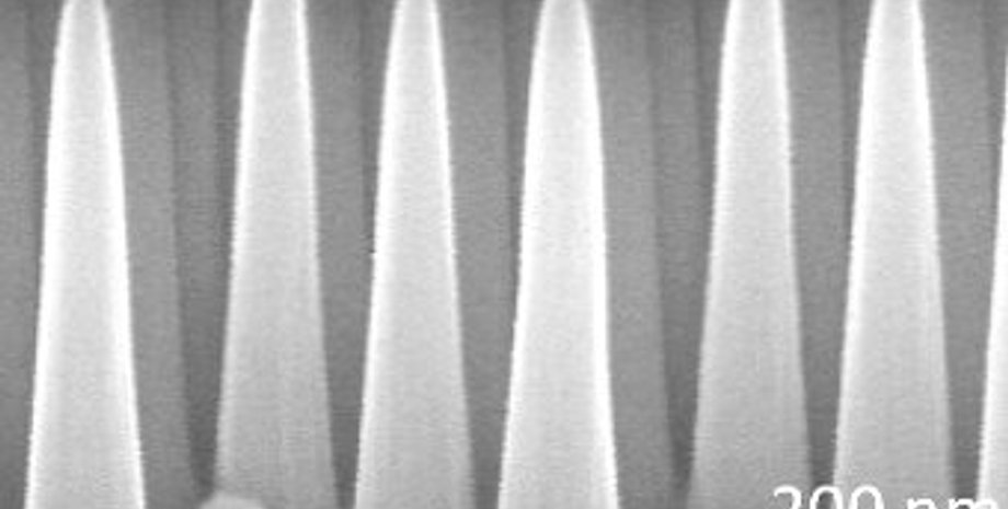 Основной особенностью стекла является наличие на его поверхности регулярно расположенных микроскопических конусов, пишет Lenta.ru. Длина каждого из них примерно в пять раз превышает ширину у основания, составляющего около 200 нанометров. Острие конусов имеет приблизительно параболическую форму.