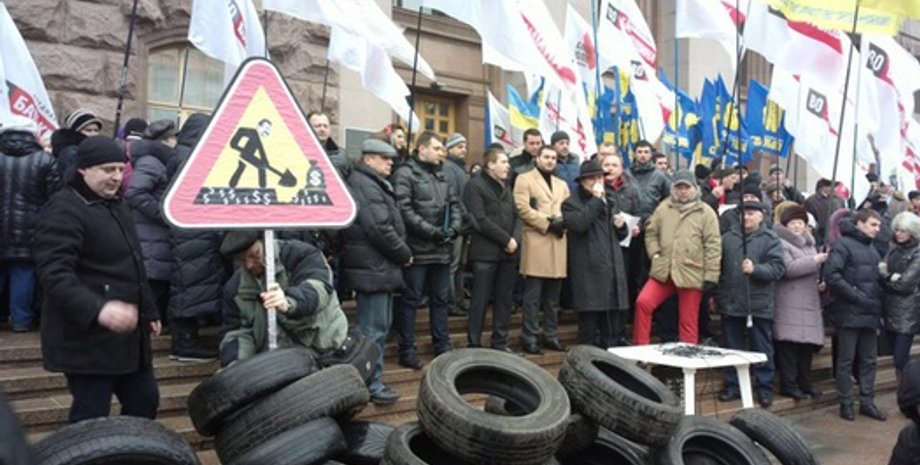 Оппозиционеры раскидали под зданием КГГА десятки шин, протестуя против плохих дорог