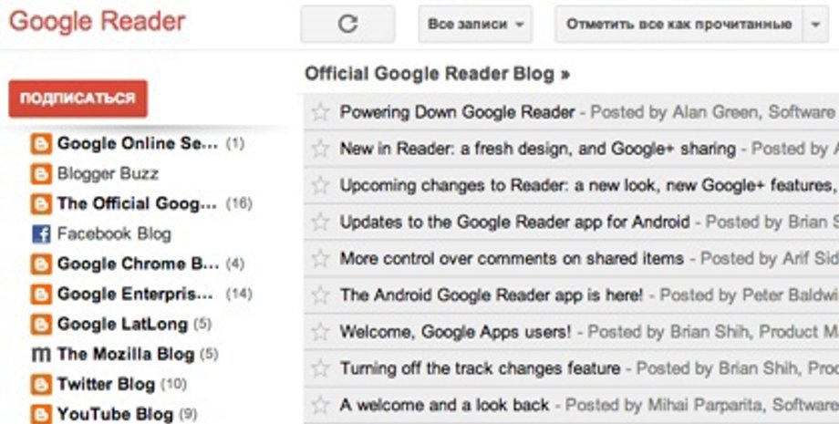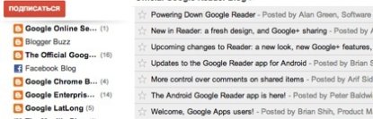 Добавим, что Google Reader был запущен в 2005 году. Сервис давал возможность собирать в единый поток новости с различных сайтов и блогов. Информация Google Reader использовалась рядом сторонних программ, включая мобильные приложения.