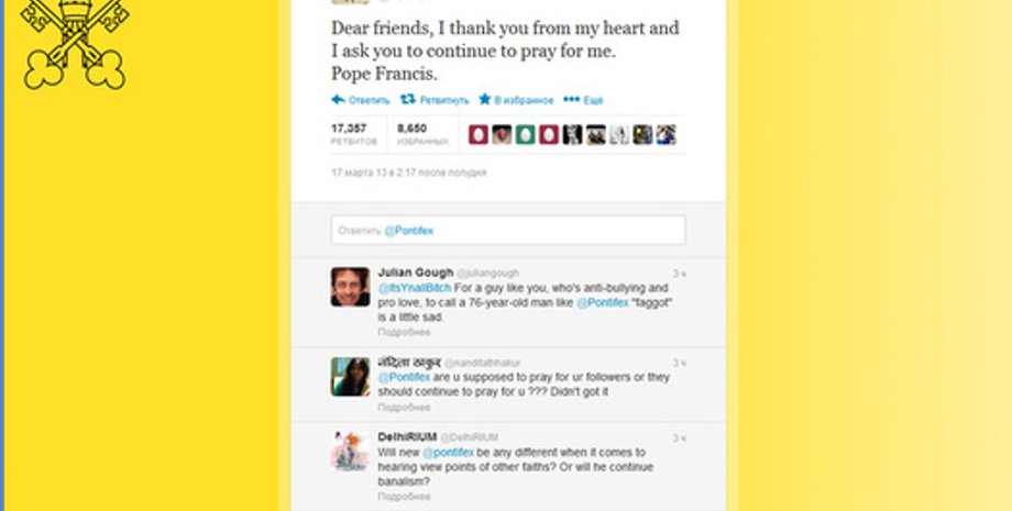 Микроблог @Pontifex, первую запись в котором Папа Бенедикт XVI оставил 12 декабря 2012 года, был временно закрыт 28 февраля, когда предыдущий понтифик оставил папское служение.