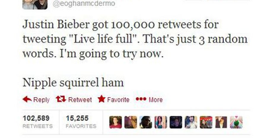 Такое высказывание канадского певца оказалось популярным и его перепостили более ста тысяч раз за сутки. Макдермотту пост Бибера показался бессмысленным и он решил повторить успех исполнителя, опубликовав твит из трех случайных слов: "Сосок белка ветчина".
