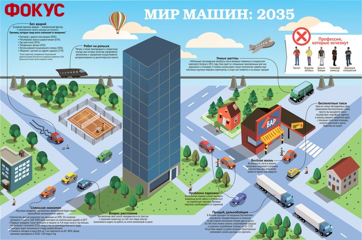 Когда доля беспилотных авто на дорогах западных мегаполисов достигнет 90% (а это может произойти уже к 2025 году), случится новая промышленная революция, предрекают в Google. Ежегодно только в США будет сэкономлено не менее 4,8 млрд часов, проведенных работоспособными гражданами не за рулем, — эффект прироста производительности в корпорации оценивают примерно в $100 млрд в год.