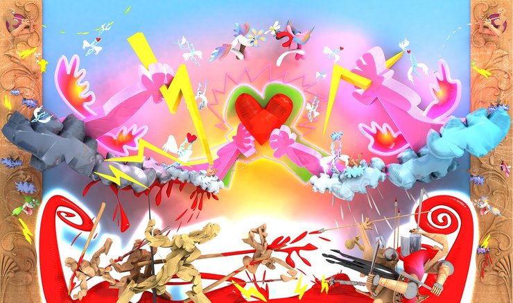 В проекте "Родина. Сегодня" художники и скульпторы отвечают на вопрос, ставший для украинцев наиболее актуальным, – что есть сегодня Родина для каждого из нас. Один из самых модных художников нового поколения, одессит Степан Рябченко, для этой части выставки предложил свою работу "Война и мир. По дороге в рай". "Работа была задумана в 2011 году. Но сегодня она стала как никогда актуальной", - утверждает Степан.