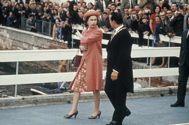 Рабочий визит в Исландию. Креповое платье упрощенного кроя в крупную бело-коралловую клетку и прямое пальто city style, лодочки с зауженными носами. В 1960-х в моду вошел образ сильной женщины, кому как не королеве первой примерить его на себя. В платьях все чаще стали появляться "рубашечные" элементы. Одним из основных принтов женского гардероба стала клетка.