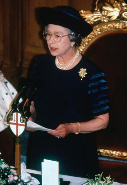 Черный цвет в 1990-х – больше чем тренд, в это время возникает особая модная философия с черной доминантой. Особый шик заключается в том, чтобы сочетать черный цвет и блеск. Желтое золото еще в тренде, белое и красное потеснят его значительно позже. Впрочем, для того чтобы носить желтое злотого с жемчугом, даже тогда требовалась смелость, и Елизавета II обладает этим ценным качеством.