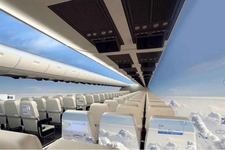 Разработка британского Центра инноваций в производстве стала возможна после появления криволинейных и гибких ЖК-экранов. Суть ее в том, что вся внутренняя поверхность салона покрыта мониторами, транслирующими картинку с размещенных снаружи камер. При этом ближайшая к пассажиру часть такого "коллективного" монитора легко превращается в экран персонального ПК с сенсорным управлением, а остальные транслируют картинку, заставляющую поверить, что вы парите среди облаков без всякого самолета. В общем, настоящее волшебство.