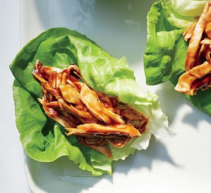 С помощью двух вилок разделите грудку на маленькие кусочки. Перемешайте кусочки в барбекю-соусе. Выложите смесь на листья латука.