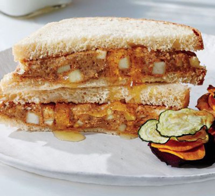 Смешайте арахисовое масло, яблоки и корицу в небольшой глубокой посудине. Равномерно распределите мед по одному ломтику хлеба. Равномерно распределите арахисово-яблочную смесь по второму ломтику хлеба. Сложите ломтики вместе.
