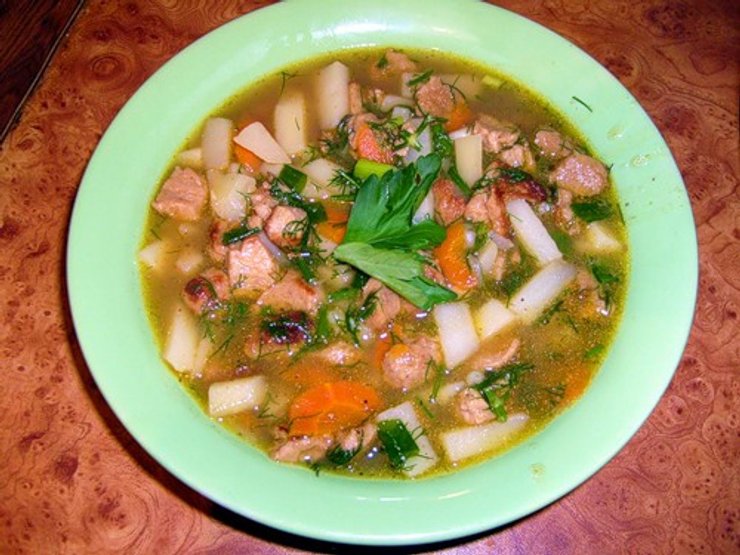 Обжарить нашинкованный лук на топленом масле. Лучше всего делать это в кастрюле с толстым дном. Добавить муки, не снимая кастрюлю с огня. Туда же отправить предварительно почищенный и нарезанный картофель. Бульонный кубик растворить в 500 мл воды. Из них 200 мл нужно сразу долить в кастрюлю, так чтобы жидкость полностью покрыла картофель. После этого уменьшить огонь до минимума, добавить соль и перец, затем варить с закрытой крышкой на слабом огне до мягкости. Для остроты украсить визитками Яроша. Подавать горячим.