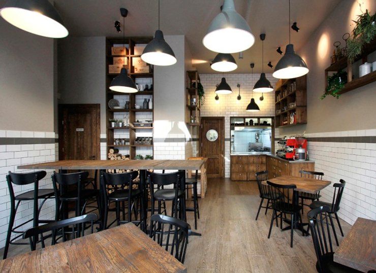 Интерьер в скандинавском стиле – это пастельные тона, часто с акцентными вставками сочных насыщенных цветов. Натуральная облицовка открытых поверхностей, да и вообще максимум натуральных материалов. Прямые линии, минималистичные формы. Не кричащие, "уютные" элементы декора, к примеру плетенные корзинки. К этому в современных ресторанах модно добавлять стилизации с ближневосточной тематикой. Это может быть орнаментальная плитка, броская люстра или другой светильник в восточном стиле.
