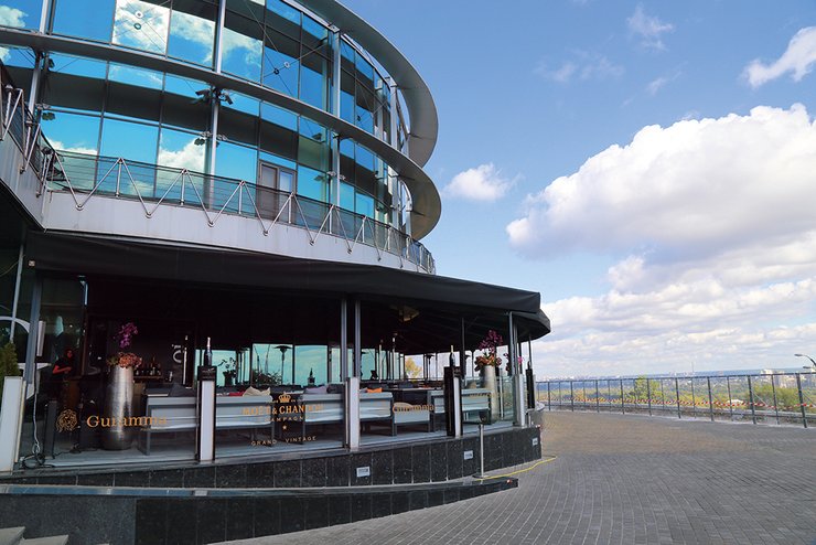 Чтобы попасть на панорамную площадку в холле отеля, нужно воспользоваться лифтами — на 8-й этаж поднимаются кабины с 1-го по 4-й номер. Затем короткий подъем по винтовой лестнице — и вы на месте. Заведение открыто с двух часов дня до двух ночи. Со среды по субботу после семи вечера здесь работает диджей. Наиболее примечательный элемент — большой аквариум с живыми рыбами и экзотическими морскими животными. Кстати, многое из того, что там плавает и ползает, фигурирует в меню. Еще одно преимущество заведения — хороший выбор кальянов и карта авторских лимонадов. И, наконец, последний бонус: автомобилисты могут бесплатно воспользоваться закрытой парковкой отеля, для этого нужно только сохранить чек из ресторана.