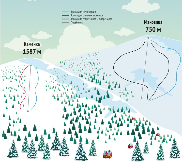 Если на соседних склонах — с гор Погар, Кремень, Менчил, Варшава — могут кататься новички и просто не очень умелые лыжники, то Тростян предпочитают профессионалы. Особенно сложным считается его северный склон.