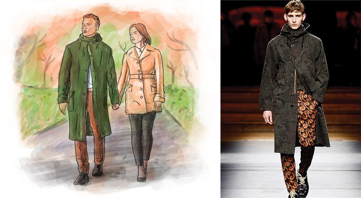 Трендовый вариант нынешней осени — плащ с абстрактным принтом, многоцветным, но не слишком ярким. Такие в этом году есть в товарных линейках большинства западных fashion-компаний, особенно много их у Dries Van Noten. К слову, неяркий принт очень практичен — если, пережив дождь, ваш плащ не будет идеально чистым, этого никто не заметит.
